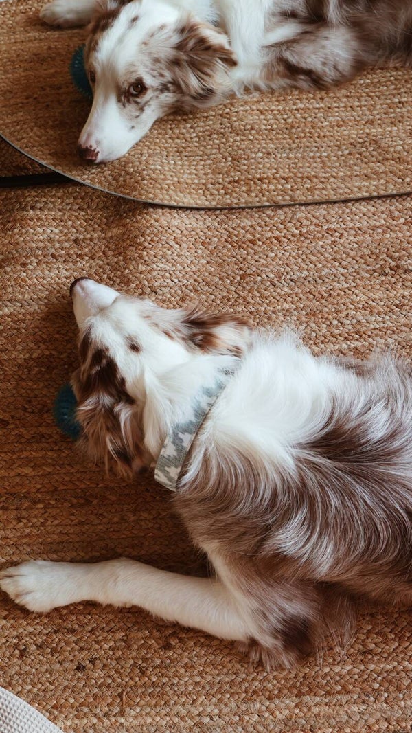 El collar Tramuntana en verde está hecho con cuero y tela de lenguas mallorquinas. Una pieza artesanal, cómoda y resistente, con un diseño fresco que recuerda a los colores de la isla.