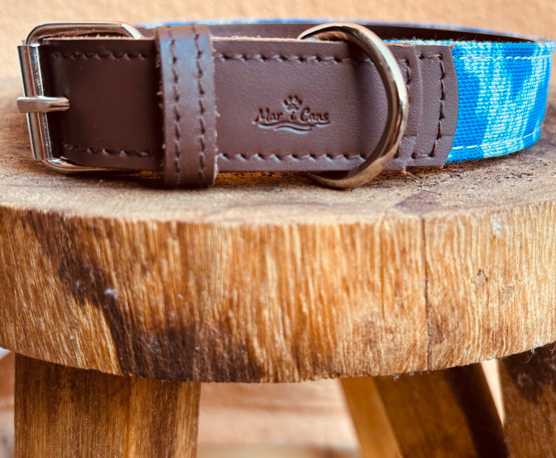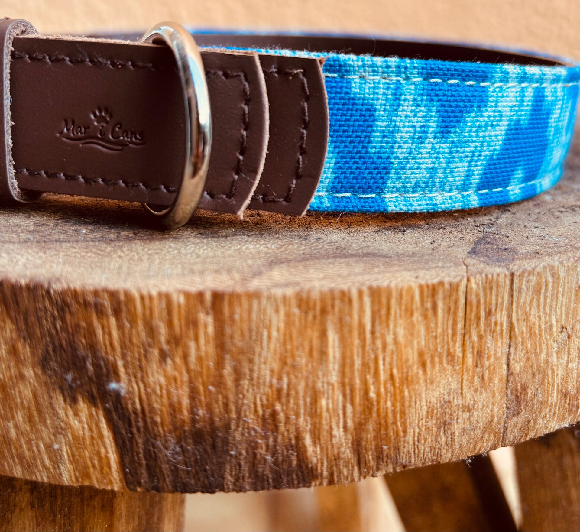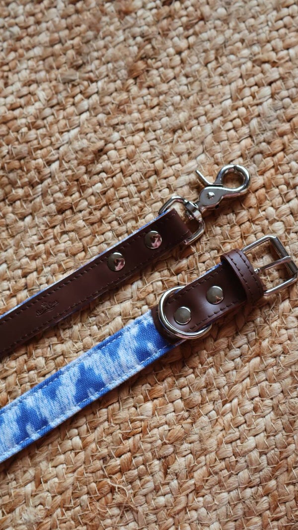 El collar Tramuntana en azul está hecho con cuero y tela de lenguas mallorquinas. Una pieza artesanal, cómoda y resistente, con un diseño fresco que evoca el mar.